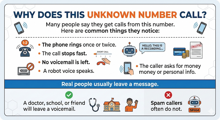 If this number calls you, stay calm. Do not feel scared. Many people get calls like this every day. The best thing to do is simple. First, do not answer the call if you do not know the number. Let it ring. Let it go to voicemail.