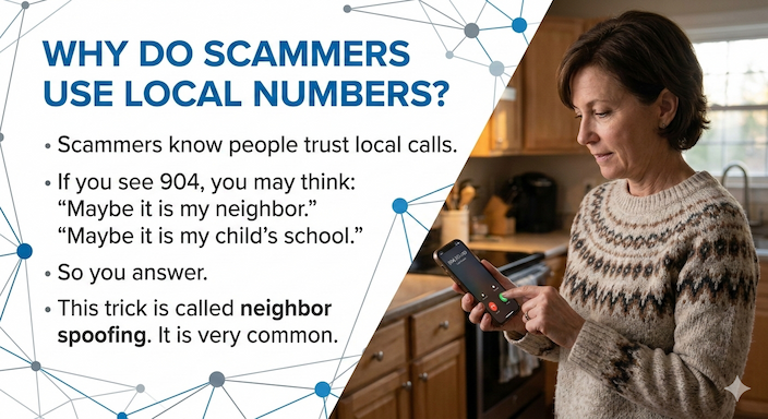 Scammers can fake phone numbers. This is called spoofing. They can make it look like the call comes from 904, even if it does not. So just because a call looks local does not mean it is safe.