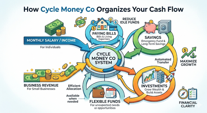 Cycle Money Co is a way of organizing money so it flows where it is needed most. Instead of leaving money in one account, the system moves it between accounts to pay bills, save, and invest. This process is sometimes called “cash cycling.” The goal is to make money always available when needed and reduce idle funds.