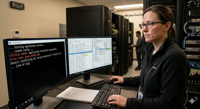 A system admin runs an application and sees ghuk-y44551/300 error after a software update. They check logs and discover a conflict between the new software and an old driver. Updating the driver and performing a registry fix Windows solves the issue.